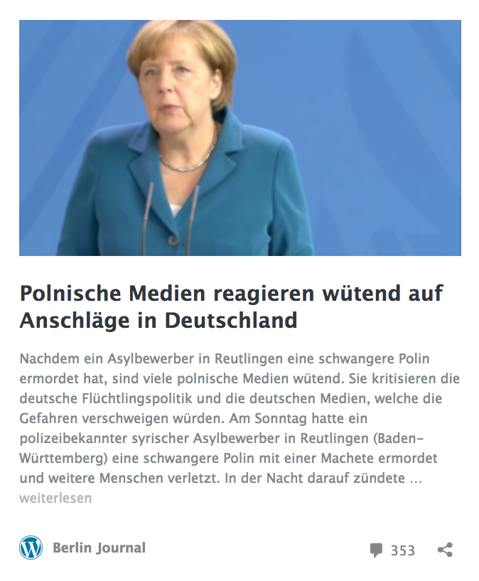 Ähnlich war es in anderen Fällen. Die von einem Syrer getötete schwangere Polin, Mutter von vier Kindern, war der Kanzlerin kein Wort wert. In den Medien wurde die Ermordete noch durch den Dreck gezogen, mit der Behauptung, sie hätte mit ihrem Mörder ein Verhältnis gehabt und es wäre eine „Beziehungstat“ gewesen. Erst durch energische Proteste in Polen, kam die Wahrheit allmählich ans Licht, aber nur im Kleingedruckten, was die Qualitätsmedien betrifft. Nur wer sich im Netz informierte , wußte, was wirklich passiert war.