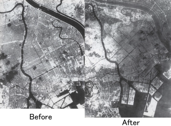 Hier wird der Vergelich dargestellt mit Luftbildern, was von Tokyo nach den mörderischen (konventionellen) Bombardements der USA übrig geblieben ist: