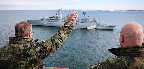 Es ist schon lächerlich, wenn jeder ausgestreckt gehobene Arm zu einem „Hitlergruß“ gemacht wird. Abwegig ist es aber, wenn das selektiv gemacht wird. Die beiden nächsten Wahlplakate von CDU und Grünen blieben unbeanstandet. Und wenn man schon überall „Hitlergrüße“ sehen will, sollte man das Bild oben betrachten. Mit derselben Haltung und Gestik wie Pistorius sein Kriegsschiff grüßt, hat auch der Führer seine Schiffe auf die Reise geschickt. Gab es dazu einen Aufschrei? Aber der ist ja auch in der SPD. Da kann es kein „Hitlergruß“ sein. Das eigentlich beunruhigende daran ist, dass willfährige Gerichte diese Anzeige gegen die AfD überhaupt angenommen und dann dieses Urteil gesprochen haben. Im Rahmen der Rechtskontinuität müsste jetzt der beteiligte Staatsanwalt ebenfalls Verfahren eröffnen gegen CDU, Grüne und ja, den Verteidigungsminister. Das werden wir nicht erleben.