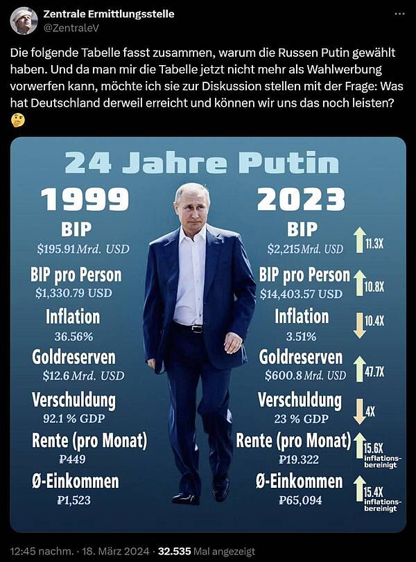 Da muss man nicht mehr daran erinnern, dass Russland innerhalb von zwei Jahren die längste Brücke Europas fertiggestellt hat, die über den Kertsch zur Krim, inklusive Planung. Dazu erinnere ich aber an die armen Geschädigten im Aartal, deren Situation immer noch nicht bereinigt ist. So kann man sagen, dass durchaus funktionsfähige Demokratien möglich sind. Nur eben „unsere Demokratie“ bedarf einer kompletten Neuaufstellung und nein, eine einfache Renovierung wird nicht ausreichen. Sehen Sie sich das Bild unten an und überlegen Sie, ob wir in Deutschland nicht besser dran wären mit einem System, wie es in Russland beste Ergebnisse bringt. Mit einem Mann wie Putin, anstatt mit Schröder, Merkel, Scholz und Merz. Demokratie als solche kann funktionieren, nur eben „unsere“ nicht.