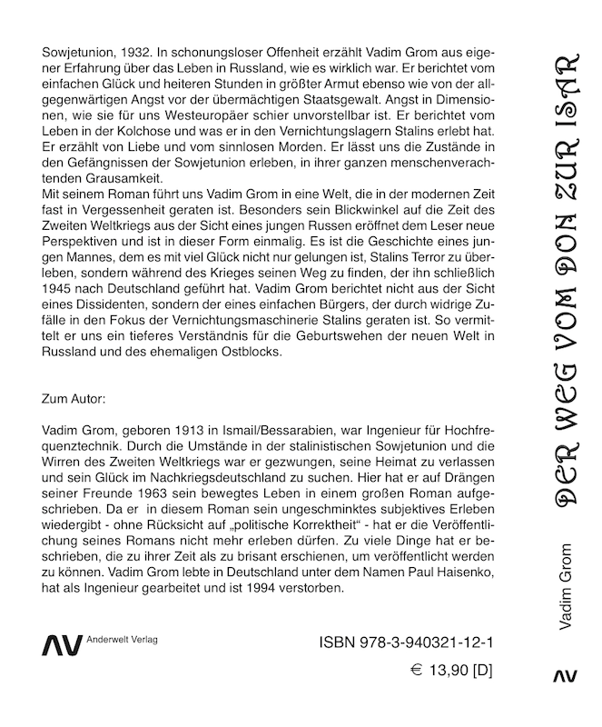 Das hier vorgestellte Exposé weicht in Details von der Romanvorlage ab, ohne die Botschaft des Romans zu verlieren. Der Roman selbst enthält eine Fülle an teilweise skurrilen und humorvollen, aber auch bewegenden Szenen, denen in einem Exposé naturgemäß nicht Rechnung getragen werden kann. Auch wenn Sie uns nicht mit der Vermittlung von Kontakten helfen können, macht das Exposé vielleicht Lust darauf, diesen außergewöhnlich spannenden und authentischen Roman zu lesen. Er ist die Schilderung des Lebens unter Stalin und die Sicht eines jungen Russen auf den Krieg und die deutsche Besatzung des Landes. Besonders aktuell ist der Teil, der in der Ukraine spielt, wo heute wieder Krieg geführt wird. Er zeigt auf, dass bereits 1944 derselbe Konflikt zwischen Westukrainern und „Moskali“ viele Tote gefordert hat.