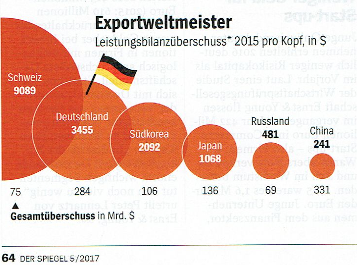 Ohne den Betrugsvorwürfen Trumps beipflichten zu wollen, muss man trotzdem gerade Deutschland die größten Vorwürfe machen. Langsam mehren sich die Stimmen, dass die Agenda-2010-Politik der Regierung Schröder ganz wesentlichen Anteil an den Problemen der Weltwirtschaft hat – an den innereuropäischen sowieso. Der deutsche Außenhandelsüberschuss bedingt zwangsweise, dass andere Länder Defizite haben müssen. Deutsche Produkte müssen folglich solange teurer werden, bis die sinkende Nachfrage zu einer ausgeglichenen deutschen Handelsbilanz geführt hat. Zielführend sind zwei Maßnahmen: Die Löhne müssen steigen, im unteren Segment um etwa dreißig Prozent, und die Arbeitszeiten müssen gekürzt werden bei vollem Lohnausgleich, wegen der sinkenden Nachfrage. Damit würde auch das Rentenproblem gelöst, das im Wesentlichen wegen des Lohndumpings entstanden ist. Mehr darüber hier Deutschland kann und muss den Euro retten